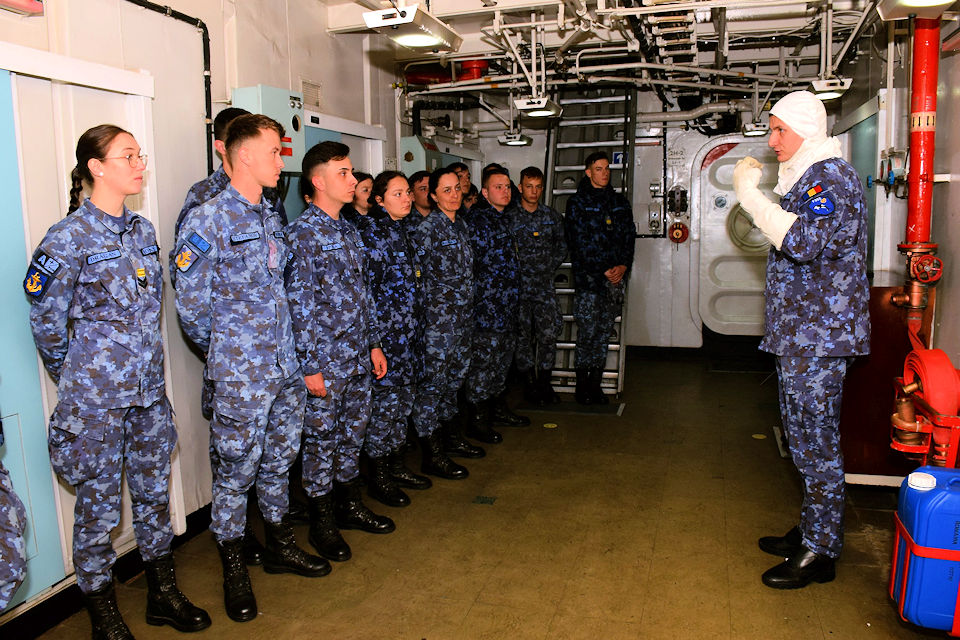 Elevii militari au simulat procedura de abandon al navei, au acționat, după cum au învățat în școală, pentru lichidarea unui incendiu fictiv izbucnit într-unul dintre compartimentele fregatei. Acest rol le-a permis să îmbrace costumele ignifuge folosite de grupele de intervenție de la bord și să își testeze capacitatea de reacție în cazul unei situații de urgență reale.