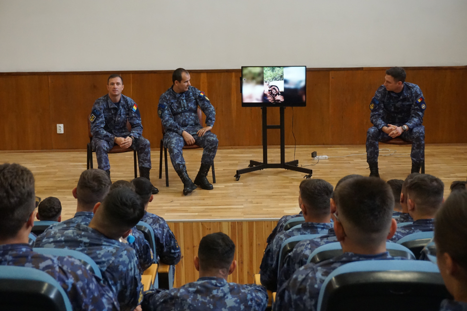 În cadrul unui simpozion organizat în sala de festivități a școlii, trei dintre instructorii militari care poartă statutul de veteran al teatrelor de operații au vorbit despre misiunile care le-au marcat cariera și despre ceea ce înseamnă, dincolo de uniformă, responsabilitatea de a-ți face datoria până la capăt.