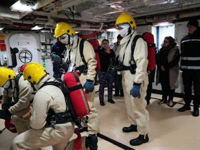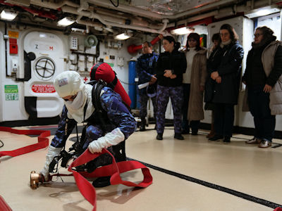 Momentul central al vizitei l-a reprezentat deplasarea la bordul fregatei „Regele Ferdinand”, unde delegația a asistat la un exercițiu real de stingere a incendiilor. „Cred că noi avem o pregătire mai solidă în domeniul acesta – firefighting și damage control – și aici pot vedea mai multe activități practice. Chiar am fost cu profesorii francezi la bordul fregatei «Regele Ferdinand» unde am asistat la un exercițiu de stingere a incendiilor și cred că cel puțin pe linia asta activitățile sunt, dacă nu similare, măcar complementare”, a subliniat lt.col. Novac.