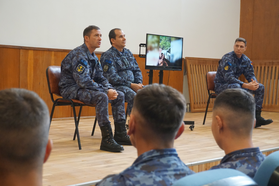Lt. col. Valerian Novac – șef al Catedrei de Artilerie și Rachete navale și antiaeriene, Cpt. Cătălin Stareț – șef Compartiment Operații și Instrucție, și M.m. cls. I Marius-Gabriel Tomița – instructor în cadrul aceleiași catedre, le-au împărtășit elevilor experiențele trăite în teatrul de operații Afganistan, dar și în alte misiuni de sprijin desfășurate sub egida NATO și ONU.