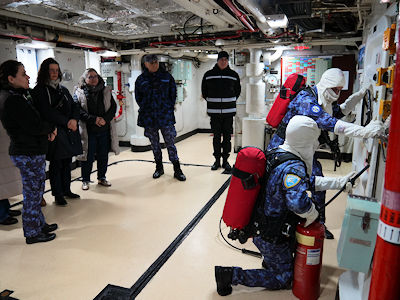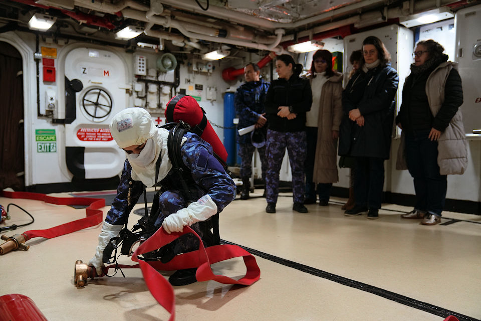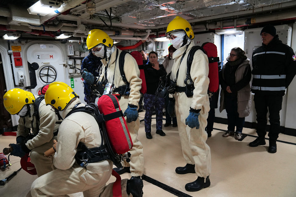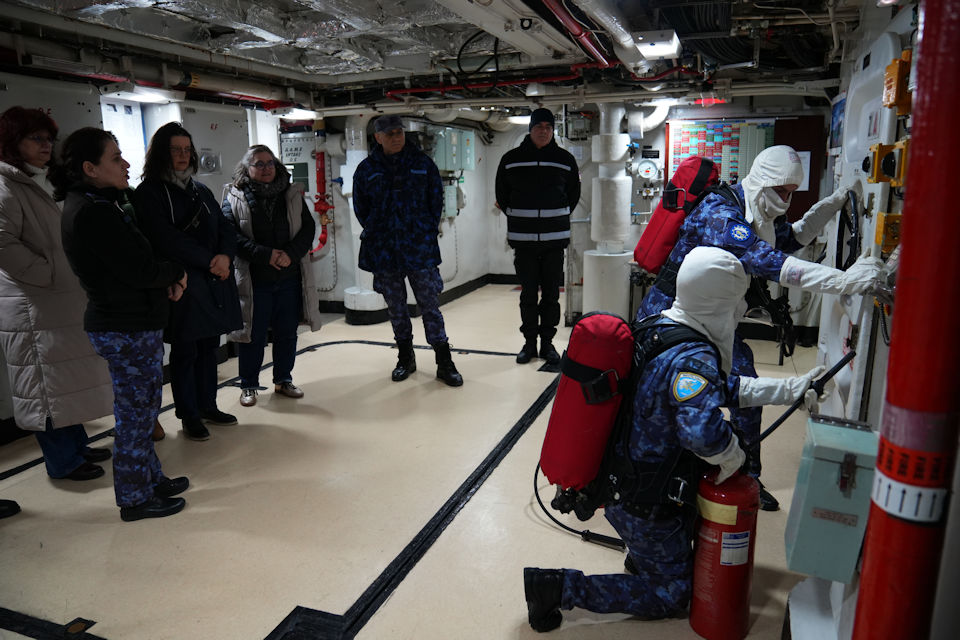 Momentul central al vizitei l-a reprezentat deplasarea la bordul fregatei „Regele Ferdinand”, unde delegația a asistat la un exercițiu real de stingere a incendiilor. „Cred că noi avem o pregătire mai solidă în domeniul acesta – firefighting și damage control – și aici pot vedea mai multe activități practice. Chiar am fost cu profesorii francezi la bordul fregatei «Regele Ferdinand» unde am asistat la un exercițiu de stingere a incendiilor și cred că cel puțin pe linia asta activitățile sunt, dacă nu similare, măcar complementare”, a subliniat lt.col. Novac.